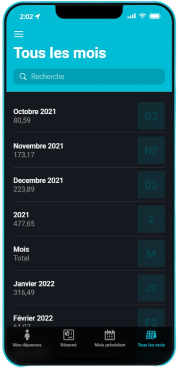 Ce dernier écran offre la possibilité de visualiser toutes les dépenses de tout les mois suivies avec l'application