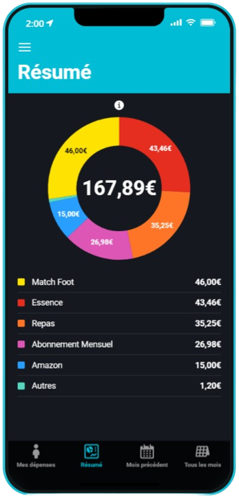 Cet écran permet d'avoir un résumé complet des dépenses du mois et par catégorie.